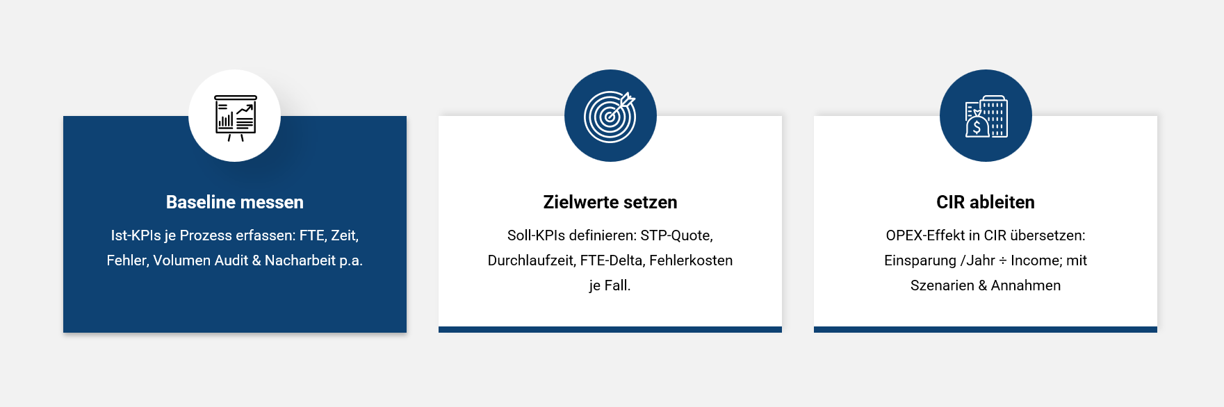 Jeder dieser Prozesse ist dokumenten‑ und workflowintensiv, weist lange Durchlaufzeiten sowie hohe Fehler‑ und Nachbearbeitungsquoten auf. Wir sehen das als Optionen, um durch gezielte Digitalisierung und Automatisierung deutliche Effizienzgewinne, Kostenreduktionen und messbare Verbesserungen der CIR zu erzielen.