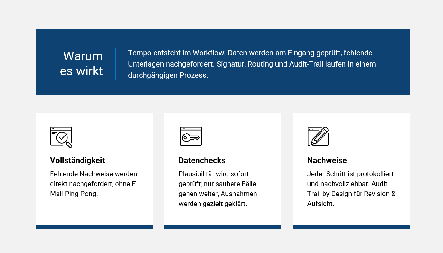 | Dokumentenhandling | Papier, manuell | Digital / automatisiert | Weniger Nachforderungen, schnellerer Workflow |
