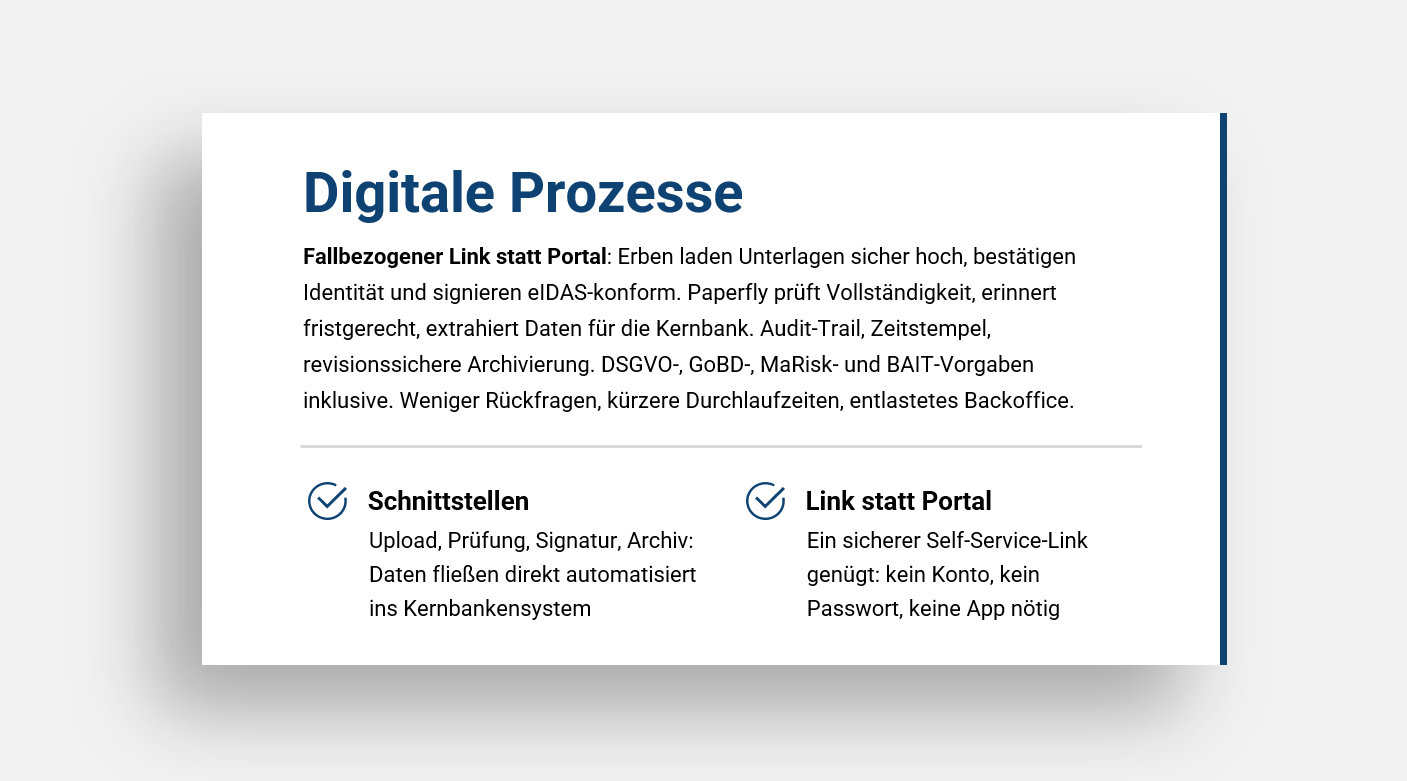 Stand 2025 verzeichnen Pilotbanken mit Paperfly eine 40-60 % schnellere Bearbeitung von Nachlassfällen durch digitale Prozesse.