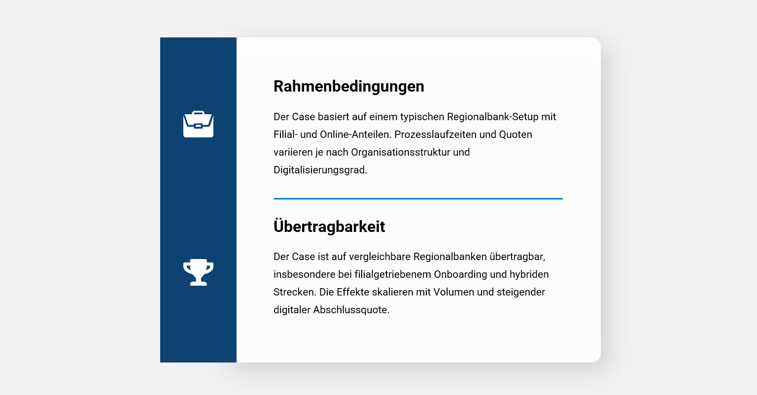 - Onboarding-Abbruchrate: Analog: 20-25 % → Digital: 5-8 %. Ergebnis: Mehr Kunden erfolgreich onboarded, höhere Umsätze.