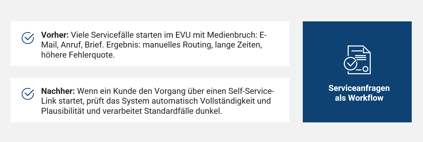 Digitale, automatisierte Workflows bieten EVUs allerdings die Möglichkeit, genau diese Schwächen zu adressieren: Kunden können Anfragen online einreichen, der Prozess läuft automatisch ab, Priorisierung und Status‑Tracking passieren systemgestützt, und wiederkehrende Anfragen werden teilweise durch KI‑gestützte Service‑Agenten (Künstliche Intelligenz) übernommen.