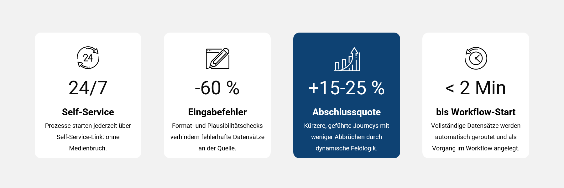 | Fehlerreduktion | Validierungen verhindern falsche oder unvollständige Angaben. | Rückfragen pro Antrag ↓ 30–50 % |