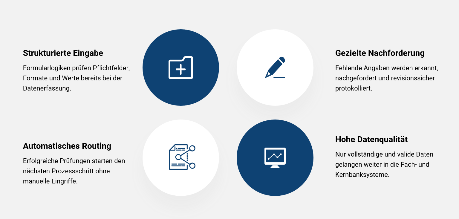 Banken profitieren von beschleunigten Abläufen, deutlich reduzierten Fehlerquoten und einer hohen Datenqualität, während Compliance-Anforderungen durch automatisierte Prüfungen jederzeit erfüllt bleiben.