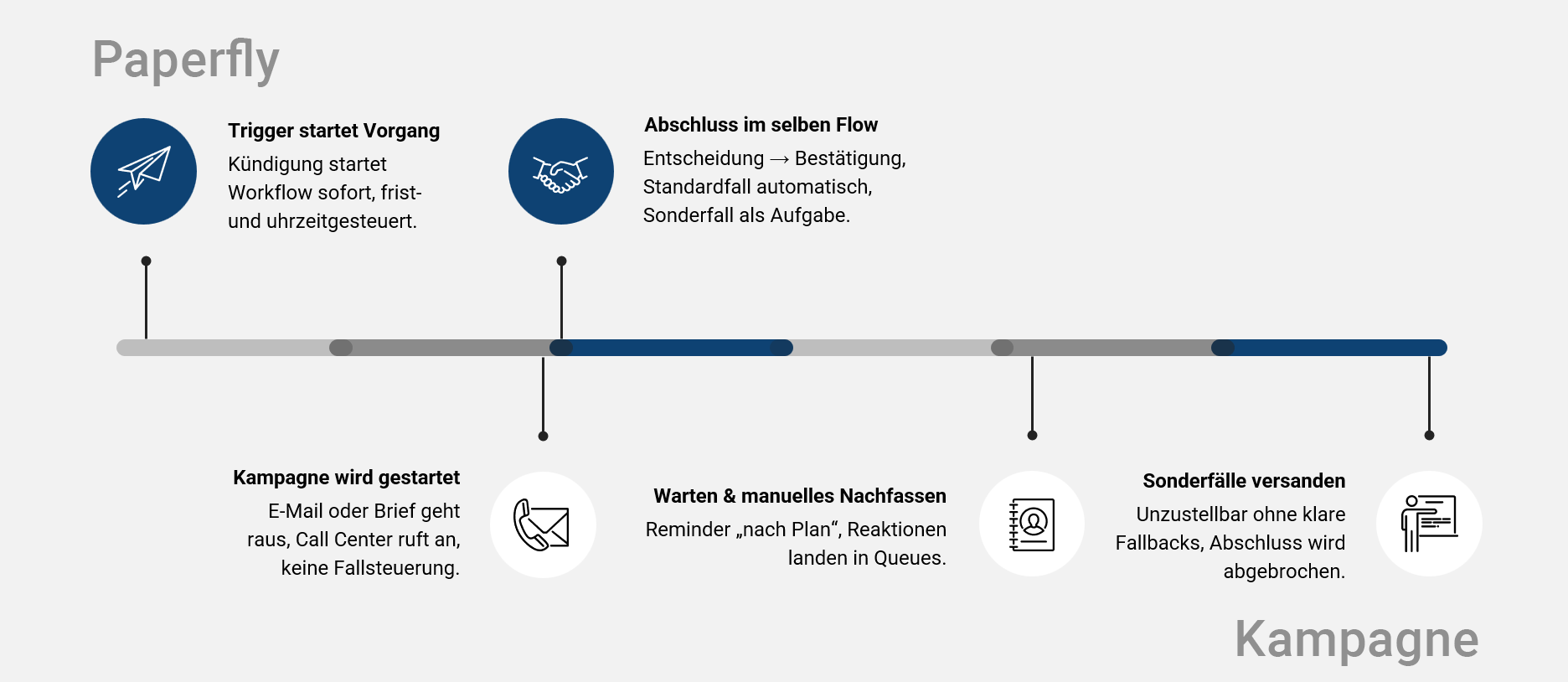 - Outbound: High-Value-Fallback, wenn „No-Response“ trotz Zustellung oder ein Rückrufwunsch kommt. Anruf klärt kurz den Grund und sendet über Paperfly anschließend den personalisierten Workflow als Self-Service-Link (damit der Abschluss nicht im Telefonat hängen bleibt).